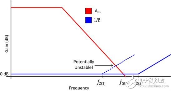 如果該零遠遠高于放大器的單位增益帶寬,如圖 3 中 fz(2) 所示,它就不會影響電路的穩(wěn)定性。但如果這個零處于或低于運算放大器的單位增益帶寬位置,例如 fz(1),噪聲增益曲線就會以大于每十倍頻程 20dB 的速率與開環(huán)增益曲線相交,表明可能不穩(wěn)定。