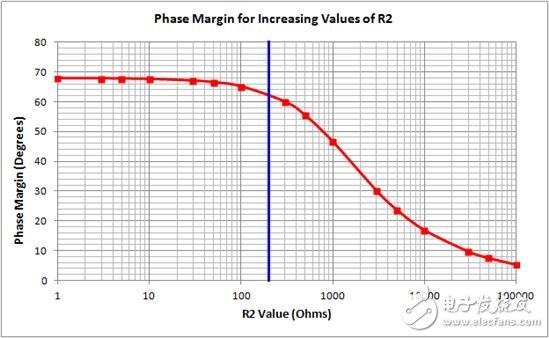 圖 5 是在 R2 值增加時相位裕度的曲線。藍線是我們用公式 5 計算出的 R2 最大值。在低于該限值時,相位裕度的降低最小,在 R2 = 200 歐姆時僅降至 62°,而高于該限值時,相位裕度則會快速降低。