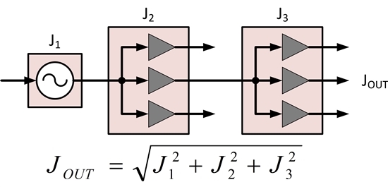 LMK00304 扇出緩沖器就是一個(gè)很好的例子。時(shí)鐘緩沖器產(chǎn)生的附加抖動(dòng)主要影響時(shí)鐘的寬頻帶噪聲。它可使用圖 2 中所示的方根公式進(jìn)行計(jì)算。