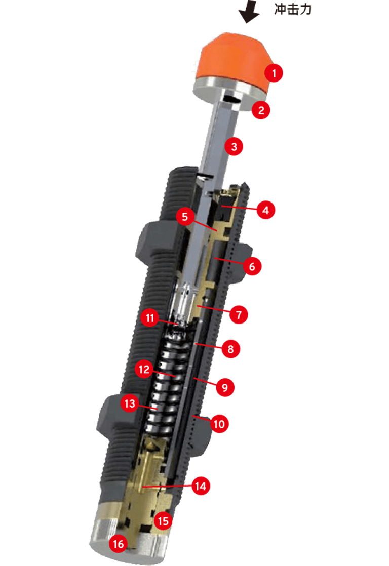 1消音套 2受撞頭 3活塞桿 4油封 5軸承 6蓄壓棉 7活塞 8排油孔 9內(nèi)管 10外管 11逆止閥 12復(fù)歸彈簧 13液壓油 14調(diào)整栓 15調(diào)整套 16調(diào)整旋鈕