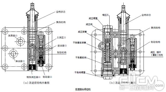 該變速操縱閥雖然具有結構簡單、故障率低、操縱方便的優(yōu)點,但其換擋液壓緩沖功能稍差,對整機操作的舒適度和變速器的壽命有一定影響。