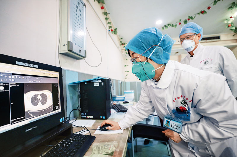 湖北省中西醫(yī)結(jié)合醫(yī)院呼吸內(nèi)科主任張繼先,把黨和人民的利益放在首位,是醫(yī)院救治一線的“帶頭人”。圖為2020年1月30日張繼先在查看病人肺部的CT影像。 長(zhǎng)江日?qǐng)?bào)記者 陳卓/攝