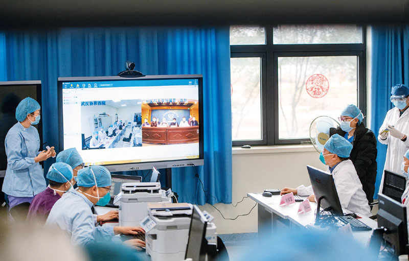 2020年2月11日,廣東醫(yī)療隊(duì)武漢前方ICU團(tuán)隊(duì)在武漢協(xié)和醫(yī)院西院與后方廣州醫(yī)科大學(xué)附屬第一醫(yī)院專(zhuān)家舉行遠(yuǎn)程視頻會(huì)診。 新華社記者 肖藝九/攝