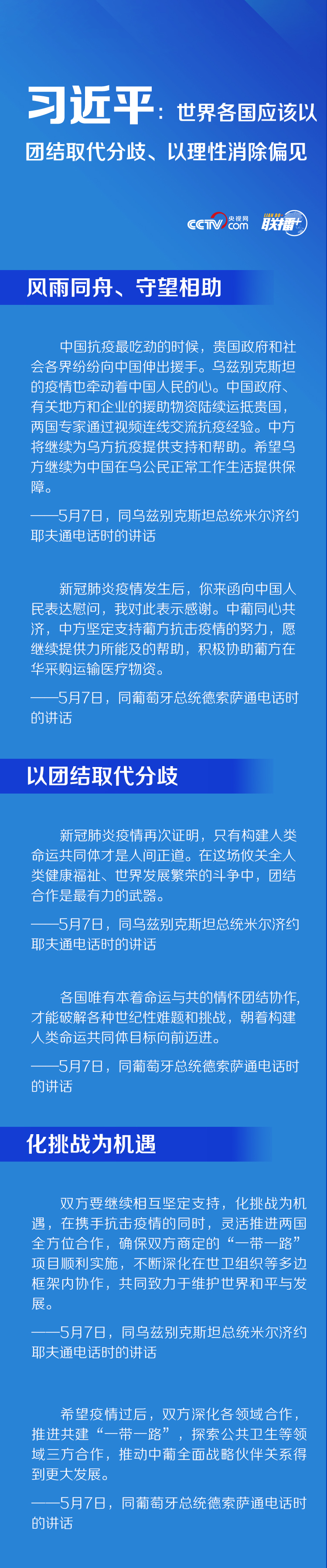 簡(jiǎn)介:世界各國(guó)應(yīng)該以團(tuán)結(jié)取代分歧、以理性消除偏見(jiàn),5月7日晚,習(xí)近平主席分別同烏茲別克斯坦總統(tǒng)米爾濟(jì)約耶夫、葡萄牙總統(tǒng)德索薩通電話,表明向有關(guān)國(guó)家提供抗疫援助、推動(dòng)國(guó)際社會(huì)團(tuán)結(jié)合作的立