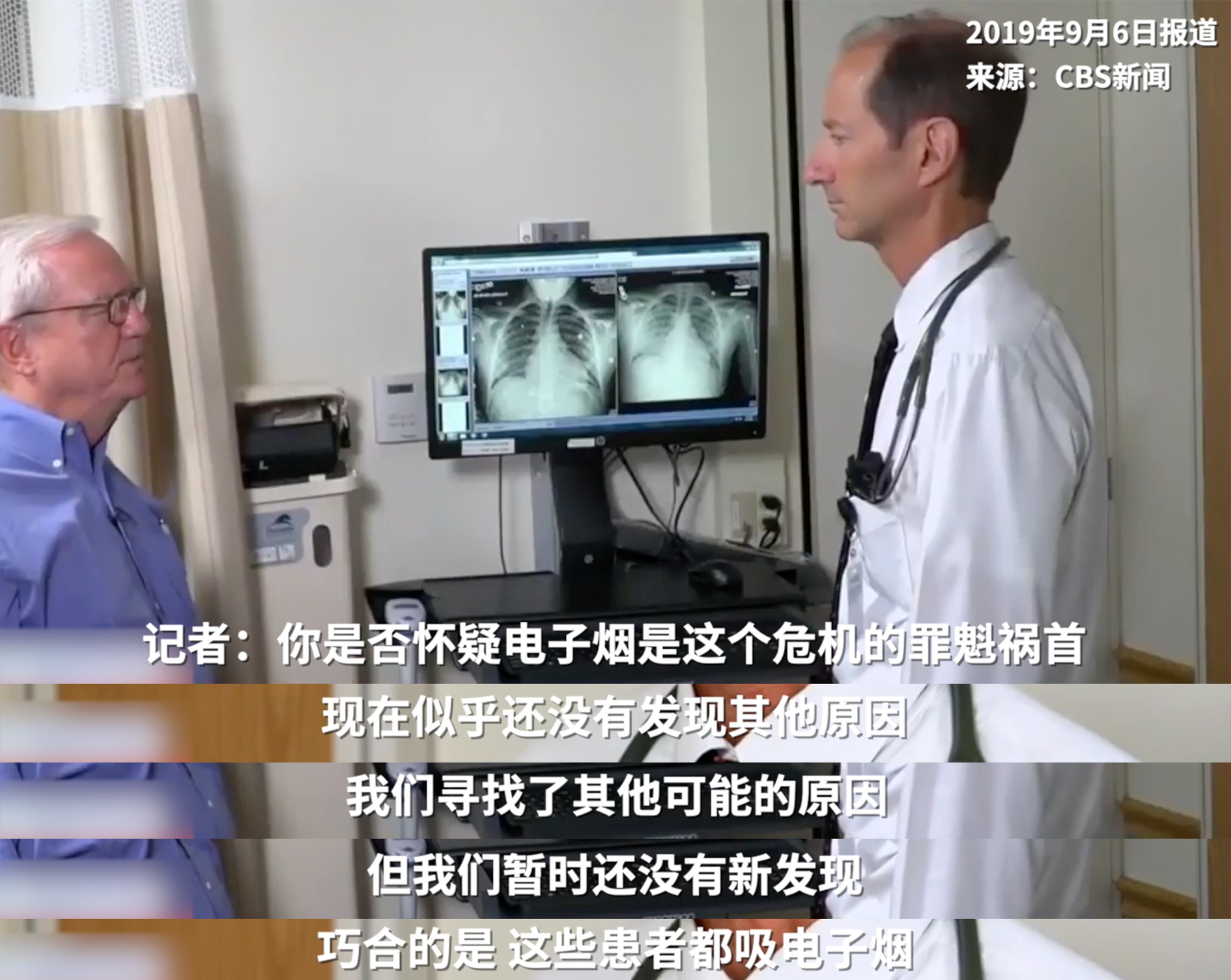 2019年9月,一位治療過電子煙肺病患者的醫(yī)生接受美國哥倫比亞廣播公司(CBS)采訪時表示,尚未發(fā)現(xiàn)有其他致病原因,但湊巧的是患者們都吸電子煙。