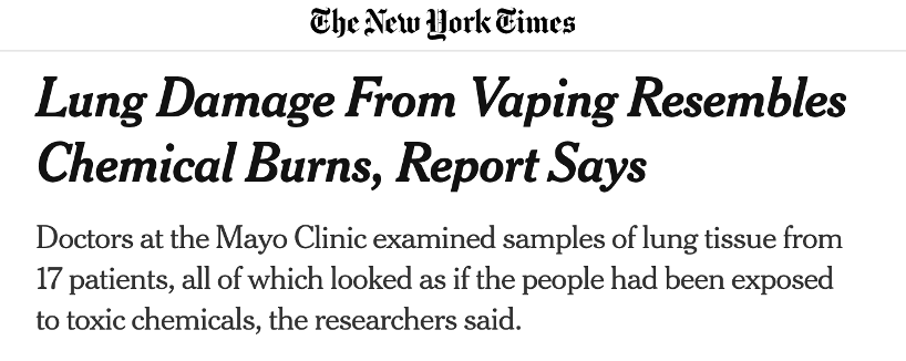 2019年10月,美國梅奧診所(Mayo Clinic)研究了17位患者的肺組織樣本后,發(fā)現(xiàn)其損傷類似于接觸有毒化學(xué)物質(zhì)而導(dǎo)致的結(jié)果。