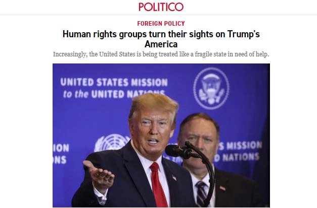 7月1日,美國政治新聞網(wǎng)站Politico發(fā)布了一篇社論,標(biāo)題為《人權(quán)組織“盯”上了特朗普領(lǐng)導(dǎo)下的美國》。文章列舉了美國近年來一系列屢遭國際關(guān)注和批評(píng)的人權(quán)問題、分裂問題等,一針見血地指出,美國越來越被視為一個(gè)需要幫助的脆弱國家。