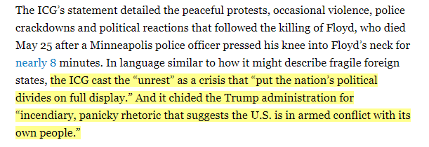 2020年6月初,國際危機(jī)組織發(fā)布了一份關(guān)于美國內(nèi)部危機(jī)的聲明,該組織以發(fā)布權(quán)威調(diào)查報(bào)告而聞名,調(diào)查的對(duì)象一般為飽受戰(zhàn)爭摧殘的國家。聲明詳細(xì)描述了美國非裔男子弗洛伊德被殺后的和平抗議、警察暴行和政治反應(yīng),國際危機(jī)組織將這場(chǎng)“動(dòng)蕩”形容為一場(chǎng)“充分顯示出美國政治分歧”的危機(jī),它指責(zé)特朗普政府“煽動(dòng)性的、恐慌的言論”,“表明美國政府正與本國人民發(fā)生武裝沖突。”